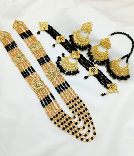 Black and Golden Pearl Mala with Earrings and Bindia Jewelry Set (ZV:21830)Black and Golden Pearl Mala with Earrings and Bindia Jewelry Set (ZV:21830)