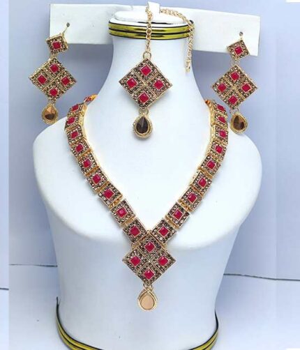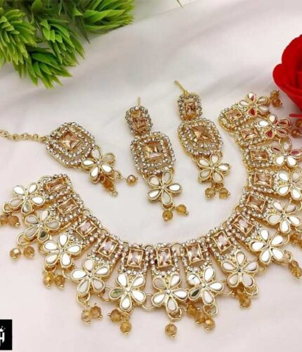 Stylish Golden Zarcon Necklace Jewelry Set With Earring & Matha Patti (ZV:18259)Stylish Golden Zarcon Necklace Jewelry Set With Earring & Matha Patti (ZV:18259)