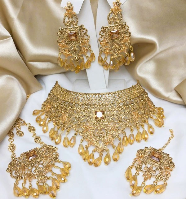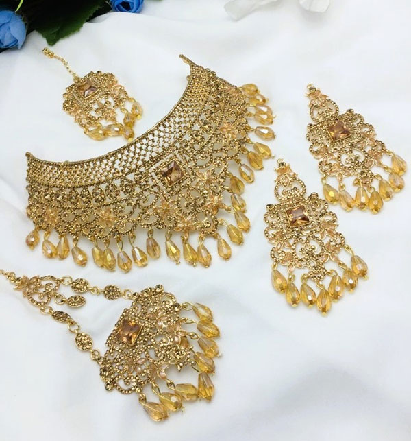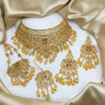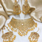 Antique Golden Pearl Wedding Necklace Jewelry Set With Earrings, Jhumar And Teeka for Women