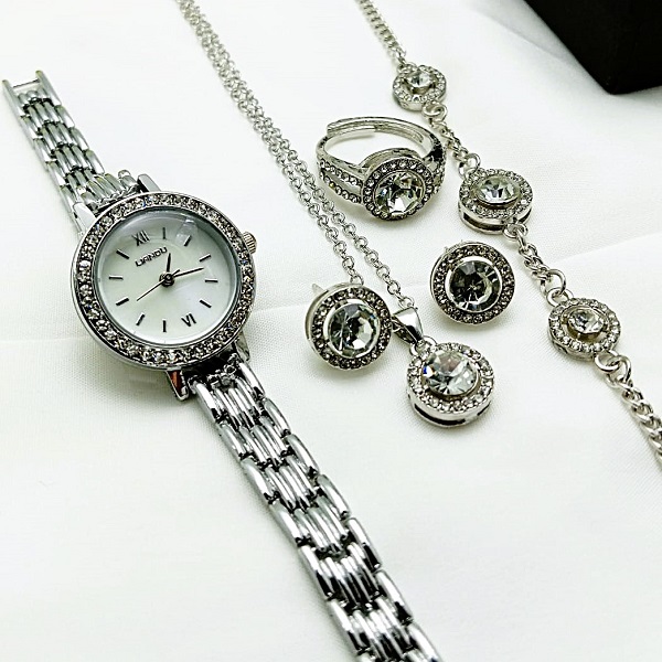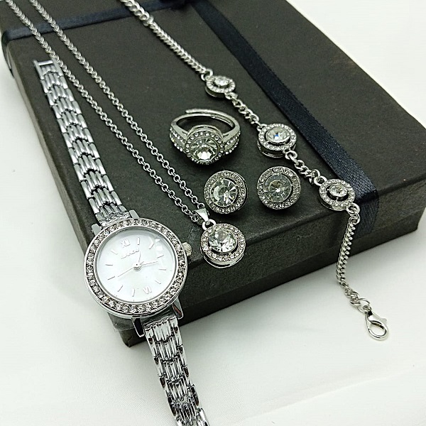 Antique Silver Zircon Watch Combo with Bracelet, Chain Locket, Ring and Tops For Girls