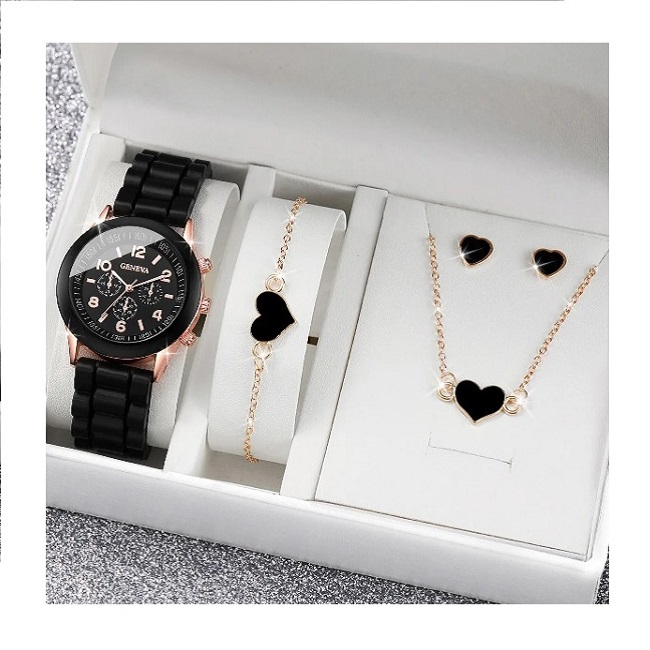 Beautiful Black Silicone Band Women Watch with Heart Jewelry Combo Set