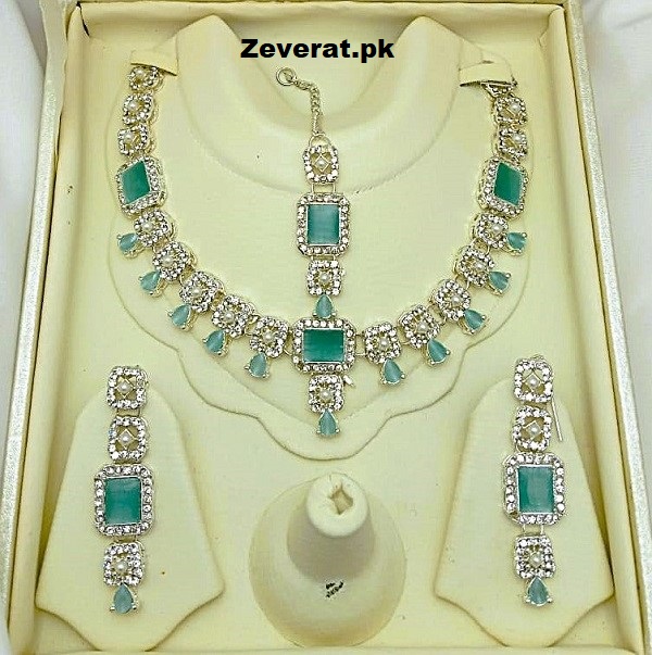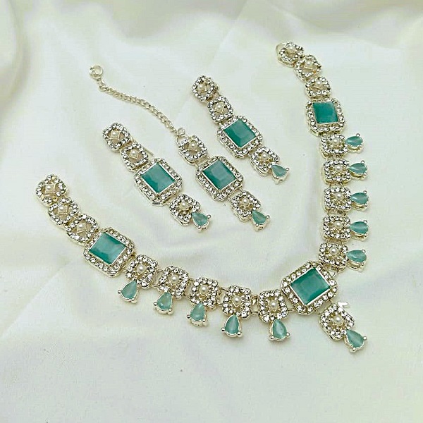Beautiful Sea Green Zircon Necklace Set with Earrings & Tikka