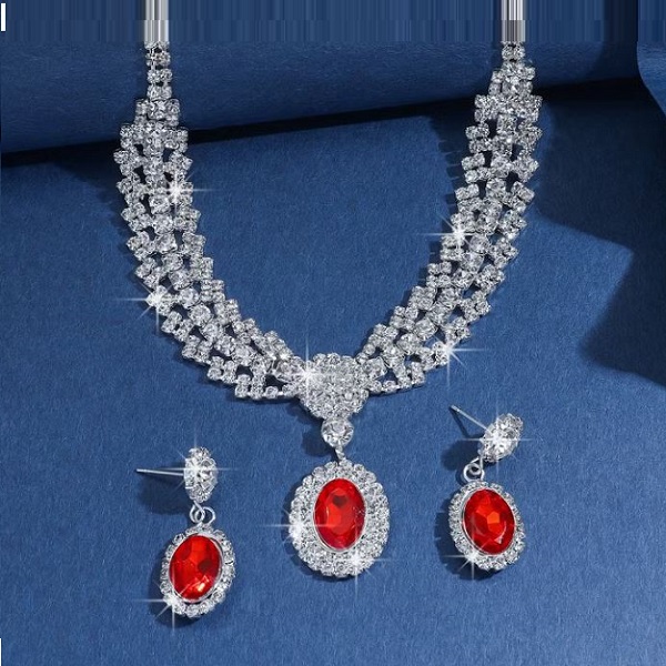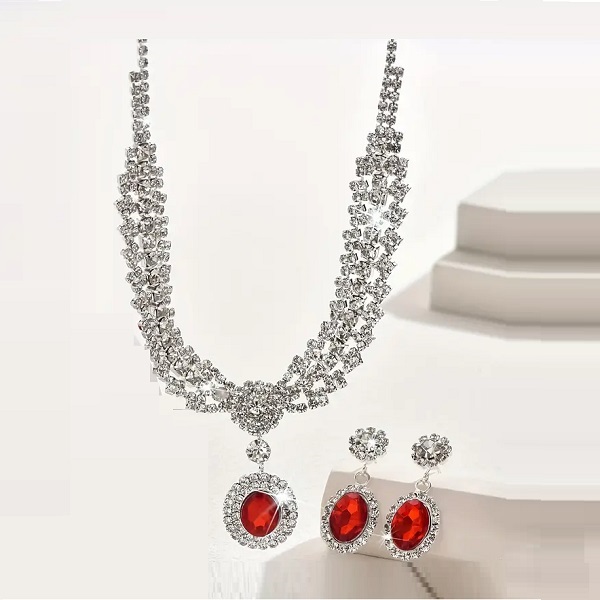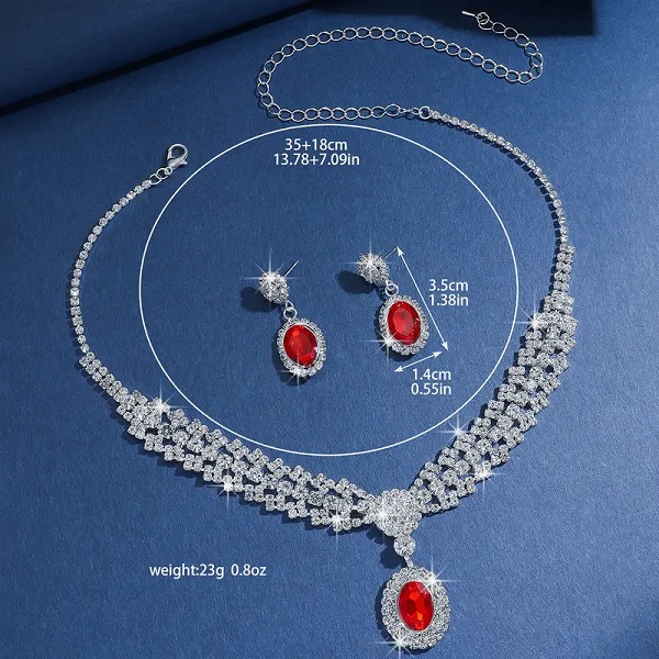Beautiful Silver Red Wedding Gemstone Necklace Jewelry Set with Earrings For Women