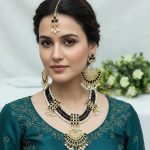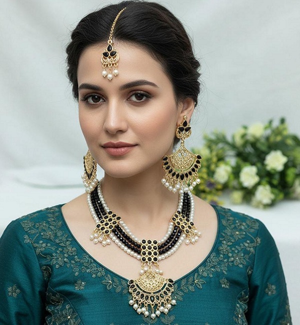 Embrace timeless elegance with this stunning 3-piece Traditional Jewelry Set. Designed to make a statement, this set features a multi-layered choker necklace, heavy drop earrings, and a matching Maang Tikka. The striking contrast between the deep black stones and the warm gold-tone filigree creates a look that is both regal and versatile.