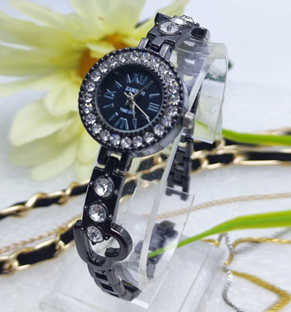 Black Jewelry Watch Heart Shape Strap With Stone (ZV:16299)