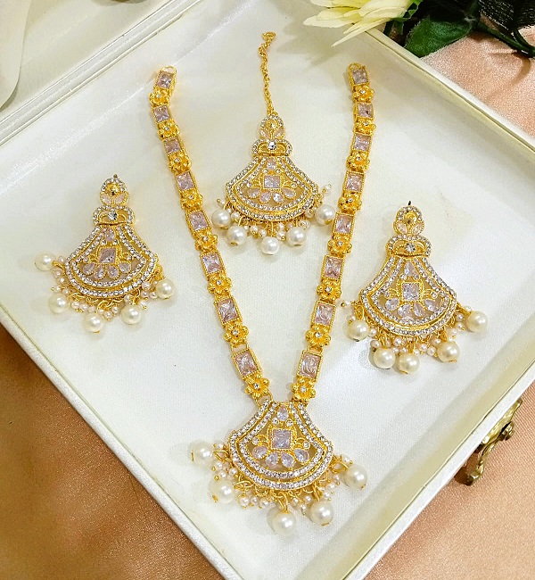 Classic Long Zircon Necklace Set with Earrings and Bindia For Women