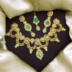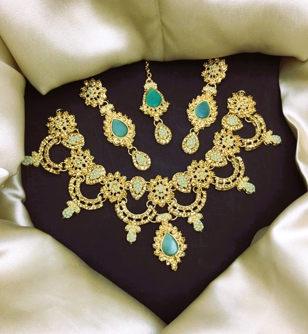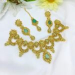 Elegant Golden Green Zircon Stone Necklace Jewelry Set with Earrings and Teeka For Women