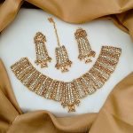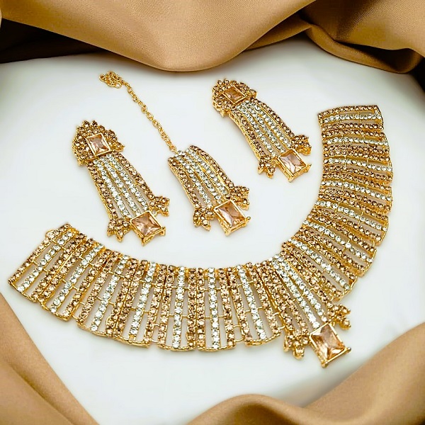 Elegant Indian Zircon Golden Necklace Set with Earrings and Bindia For Wedding