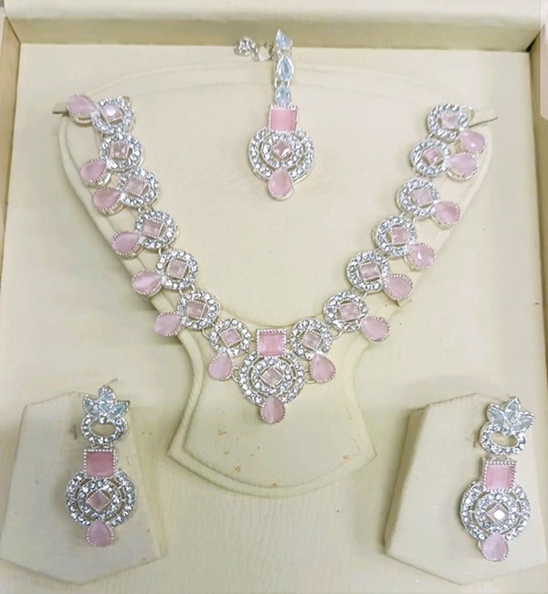 Elegant Silver Tea Pink Zircon Party Necklace Set with Earrings and Bindia For Girls