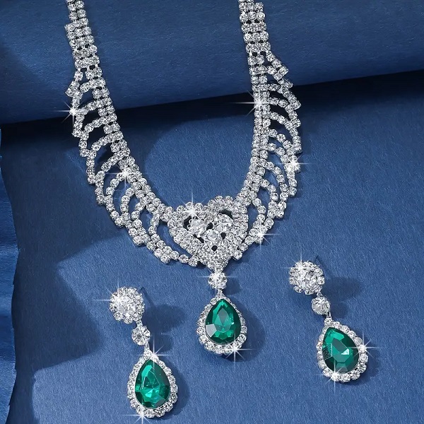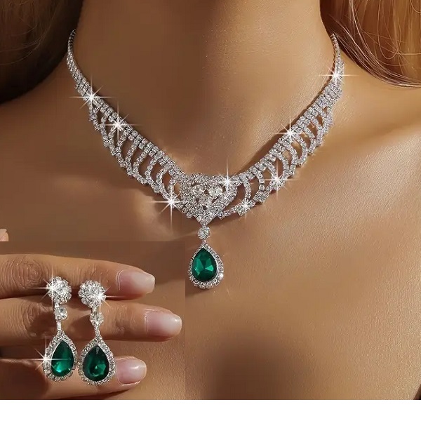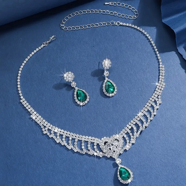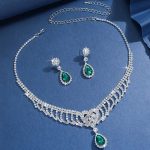 Elegant Teardrop Silver Green Necklace Jewelry Set with Earrings For Women