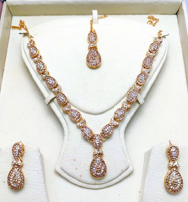 Be the first to review “Elegant Zircon Golden Necklace Set with Earrings & Bindia (ZV:15580)” Cancel reply