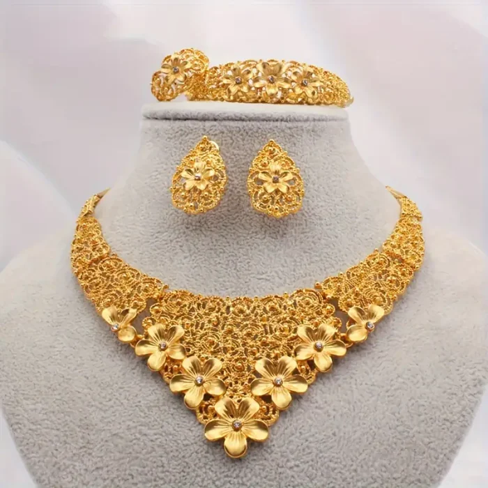 Gold Plated Wedding Necklace Jewelry Set With Earrings, Ring and Bracelet For Women