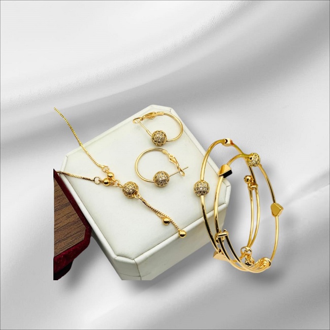 Gold Plated Zircon 3 Pcs Balls Combo Gift Set Chain Locket with Balls Bali & 2 Pieces Adjustable Balls Kara For Girls