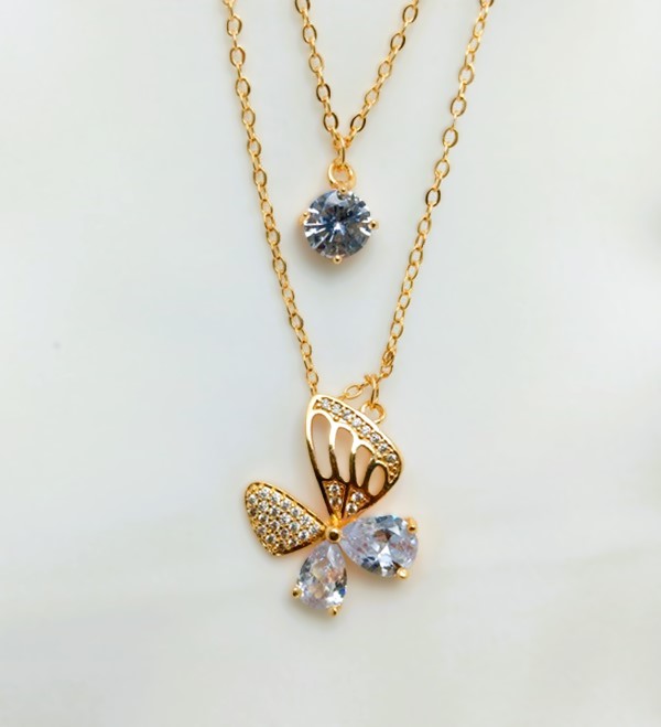 Golden Double Layered Butterfly Zircon Chain Locket Necklace For Girls