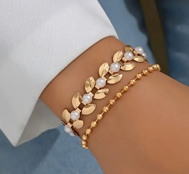 Golden Fashion Pearls Bracelet Set 2pc For Women