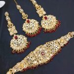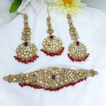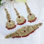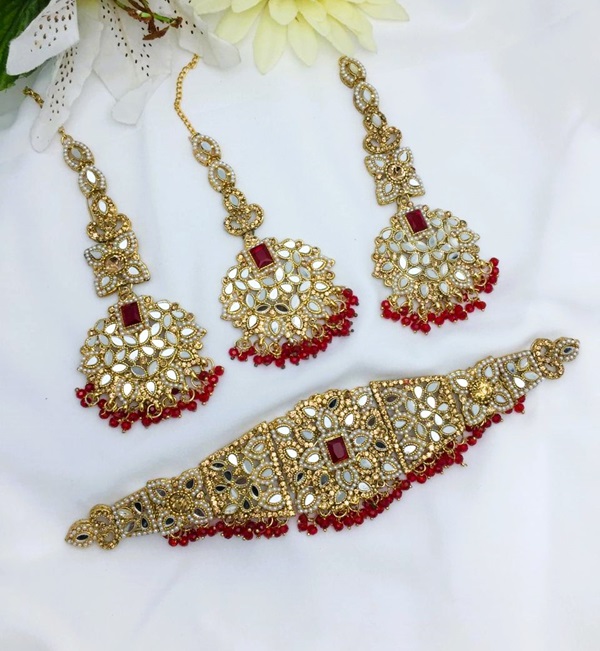 Golden Maroon Bridal Heavy Choker Mirror Necklace Set with Long Earrings and Matha Patti For Women