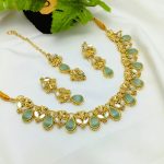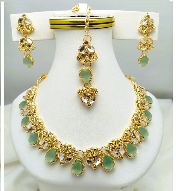 Beautiful Golden Sea Green Kundan Stone Necklace Fashion Jewelry Set with Earrings and Bindia For Ladies