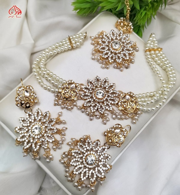 Golden Zircon Pearl Choker Set with Earrings and Bindia For Women