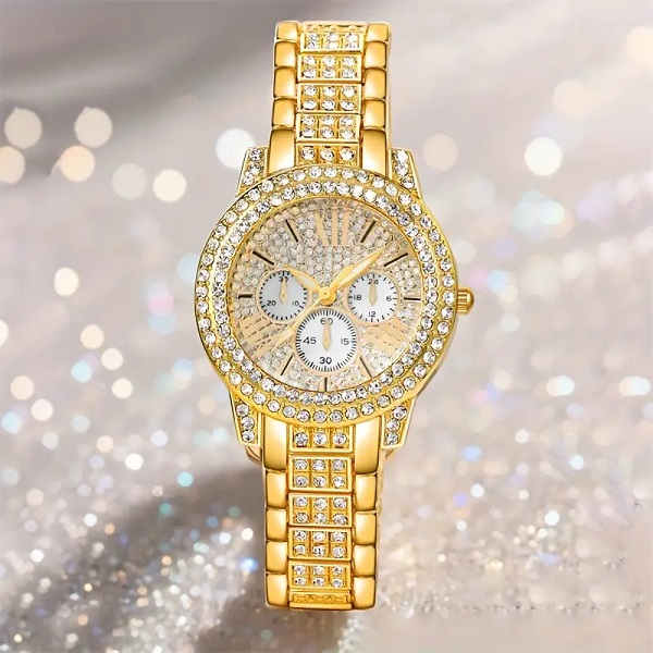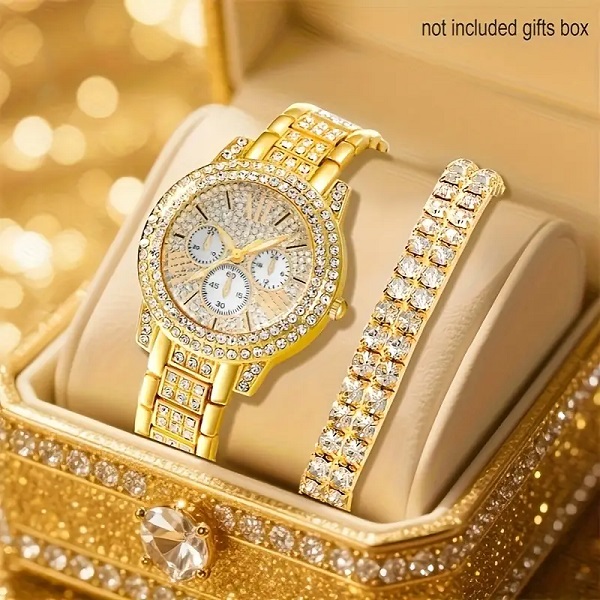 Golden Zircon Watch Set with Bracelet For Women