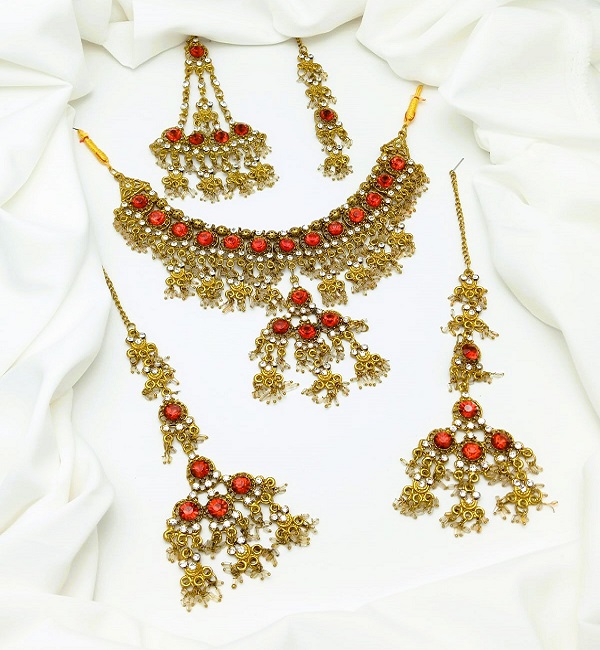 Indian Antique Gold Bridal Wedding Necklace Set with Jhumar, Tika & Long Jhumka For Women