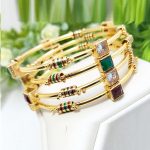Traditional Meenakari bangles with AD Zircon, featuring a beautiful blend of filigree work and vibrant Zircon, and meenakari detailing. Handcrafted in Gold Plated, these Indian-style kangan bangles are designed to bring a touch of color and sophistication to any outfit. Four sizes are available to fit comfortably as 2, Sawa, Dhai and Ponay 3. A timeless addition to your jewelry collection, perfect for adding a touch of artistry and charm.
