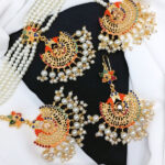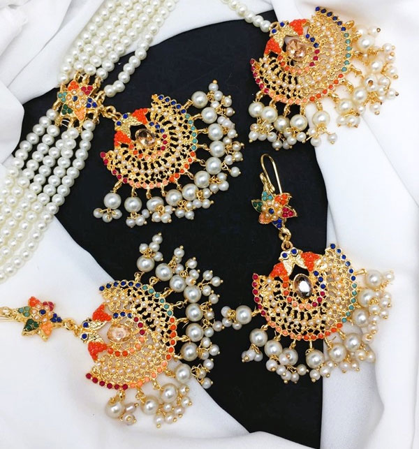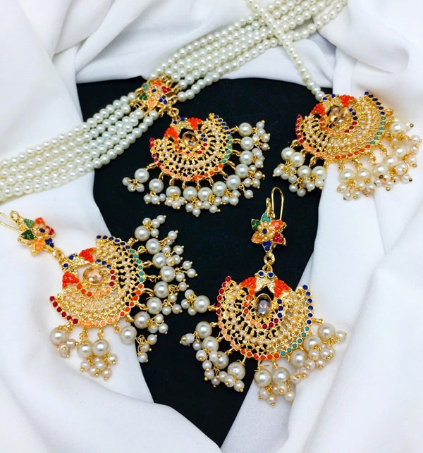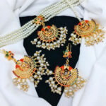 Indian Pearl Noratan Choker Necklace Set With Earrings And Tikka For Women