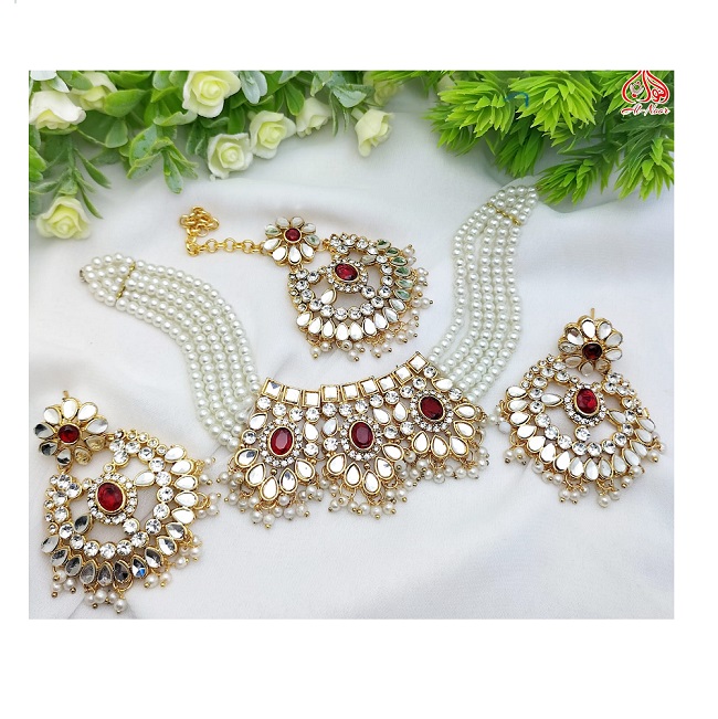Indian Zircon Farshiya Kundan Gajra Choker Set with Big Earrings and Tika