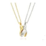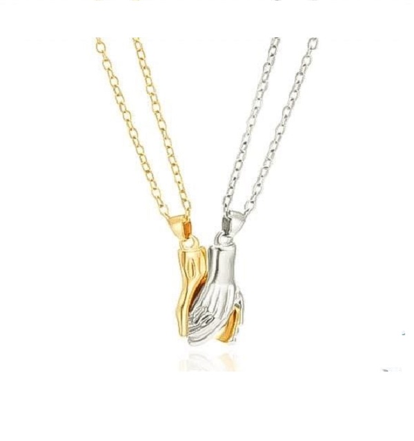 Celebrate meaningful connections with this elegant two-tone handshake pendant necklace. Designed to symbolize unity, trust, and everlasting bonds, this unique piece features interlocking hands in contrasting gold and silver tones—representing harmony between two souls.