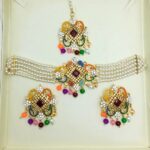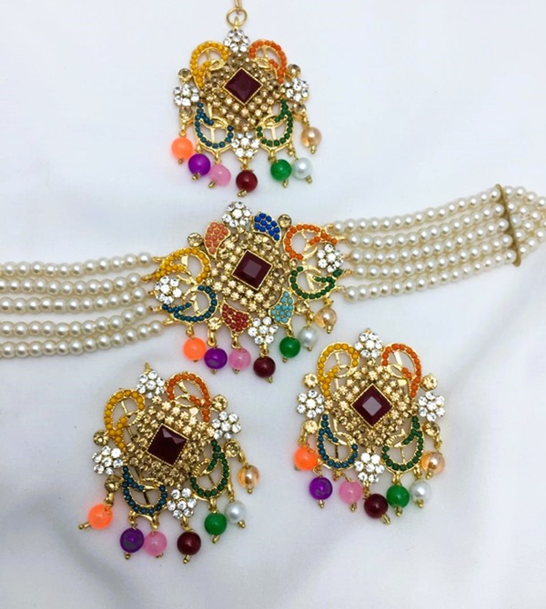 Luxurious Pearl Navratan Choker Necklace Set With Earrings And Tikka For Women. Traditional and significant of the Navratna style, the Navratna Choker is worked in Pearl and Zircon.