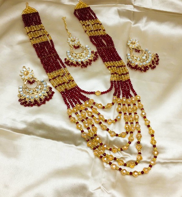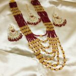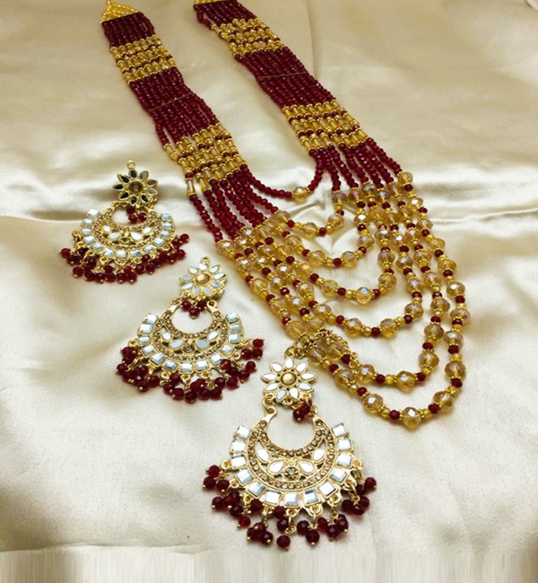 Maroon and Golden Pearl Mala with Earrings and Bindia Jewelry Set For Girls