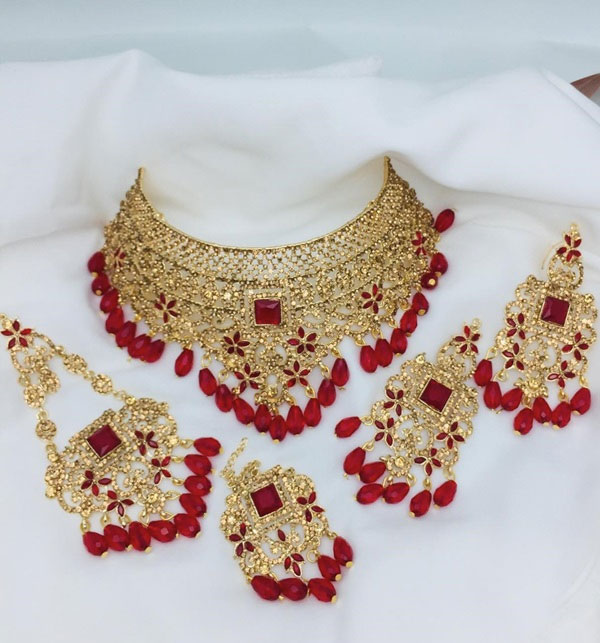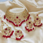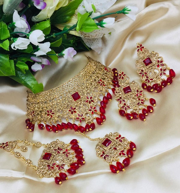 Maroon Pearl Golden Wedding Necklace Jewelry Set with Earrings, Jhumar and Teeka For Women