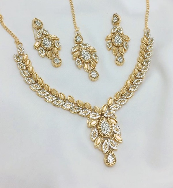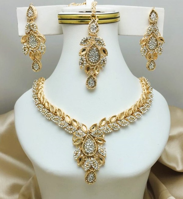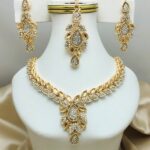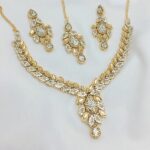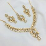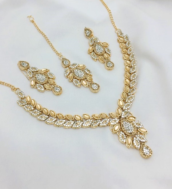 Golden Zircon Kundan Necklace Jewelry Set With Earrings and Tikka For Women