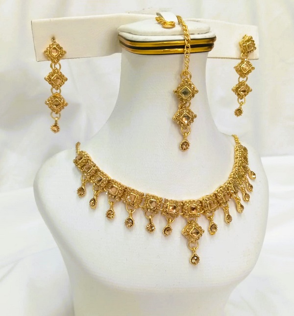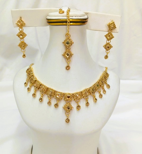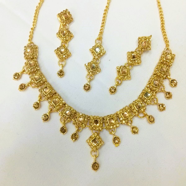 Stylish Golden Zircon Necklace Set with Earrings and Tikka For Ladies