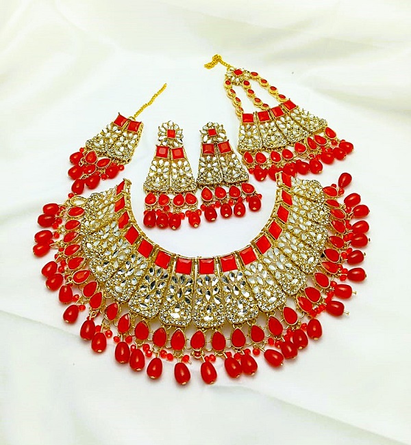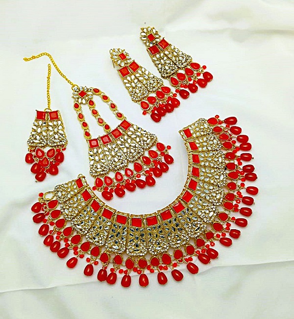 Golden and Red Kundan Wedding Necklace Set With Earrings, Tikka and Jhoomar For Women
