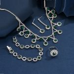The Silver Green Zircon Combo Necklace Set with Earrings, Bracelet and Ring is ideal for infusing elegance into any dress. Adorned with sparkling green zircon, this set enhances your look for weddings, parties, and celebrations. Manufactured from high-quality materials, it guarantees durability and long-lasting shine.