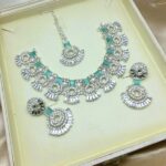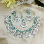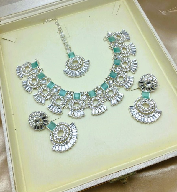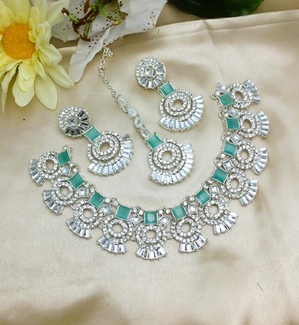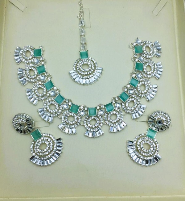Silver Sea Green Zircon Mirror Necklace Jewelry Set with Earrings and Teeka For Women