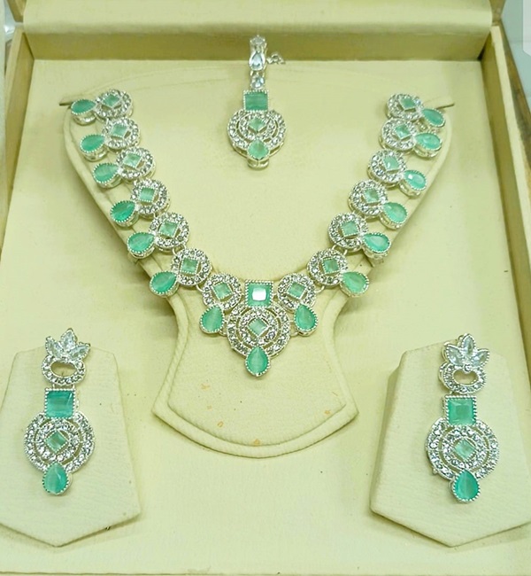 Silver Sea Green Zircon Necklace Set with Earrings and Bindia For Girls