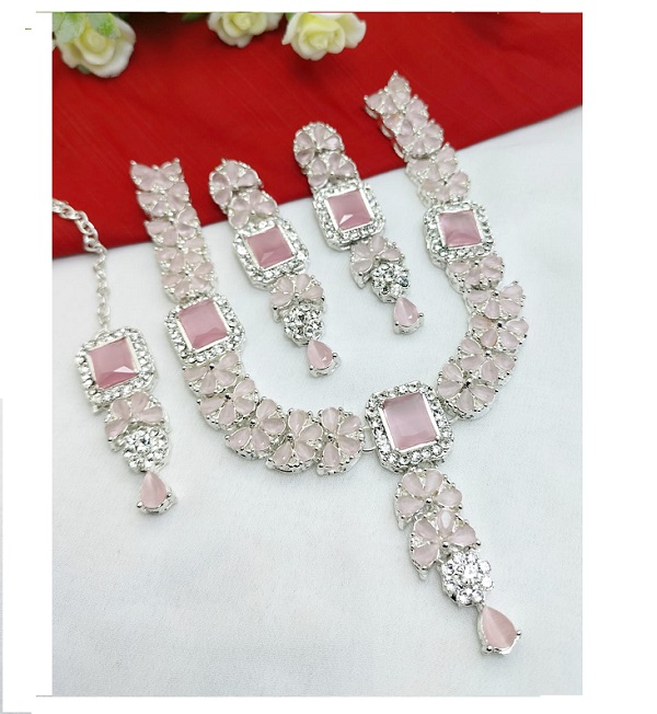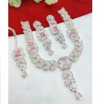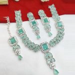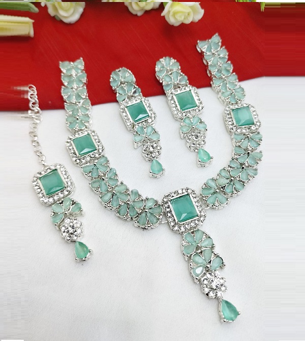 Silver Zircon Necklace Set with Earrings and Bindia For Women