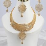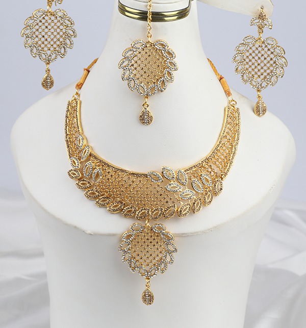 Golden Party Wear Jewelry Set Earring And Matha Patti (ZV:1538)