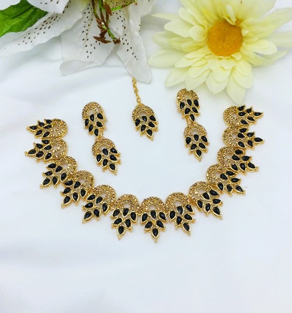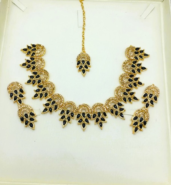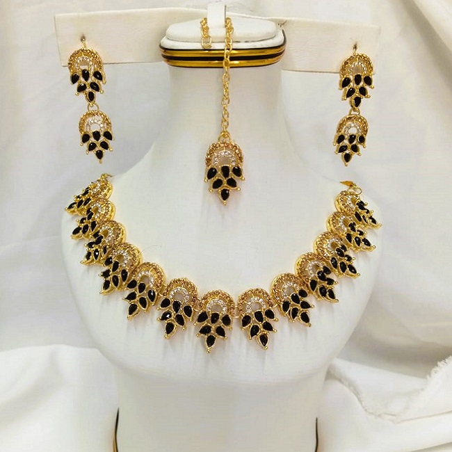Stylish Black Golden Zircon Necklace Jewelry Set with Earrings and Teeka