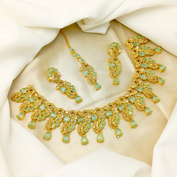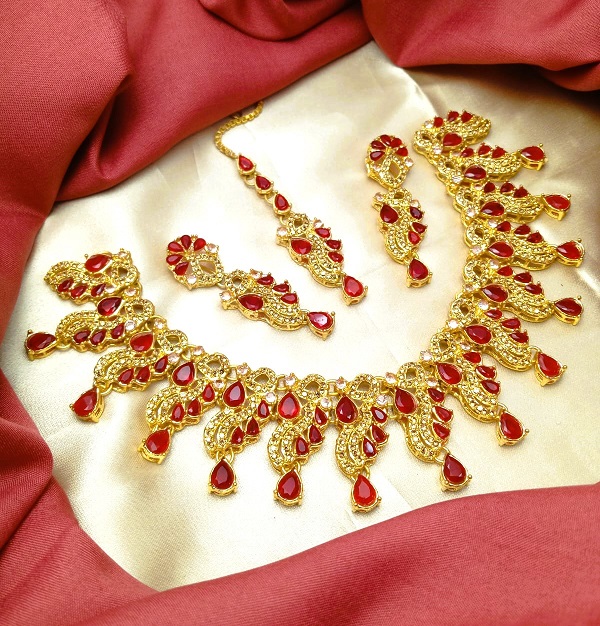 Stylish Golden Zircon Necklace Set With Earrings and Bindia For Women