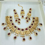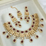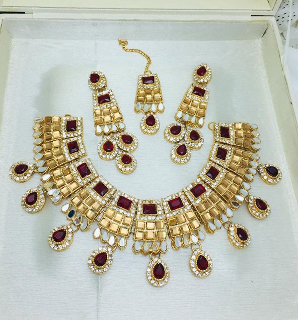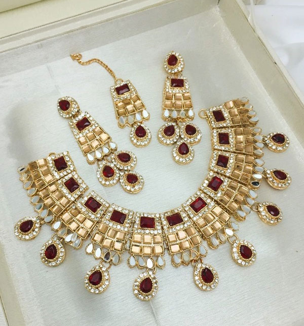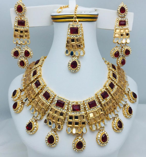 Stylish Maroon Golden Zircon Wedding Necklace Jewelry Set with Long Earrings and Teeka For Women