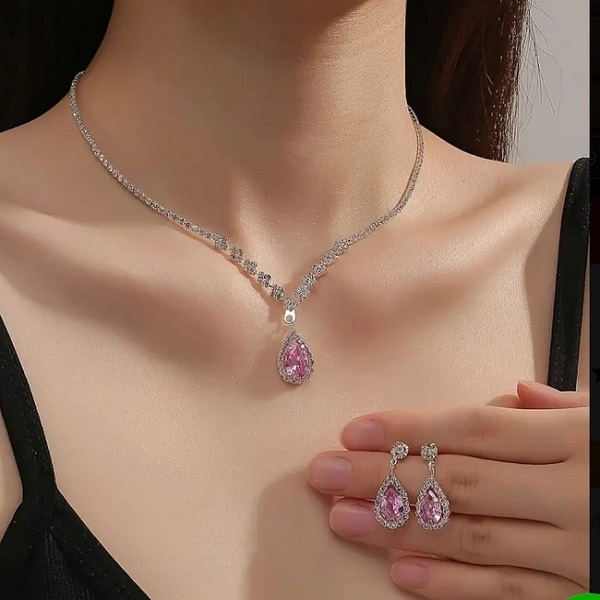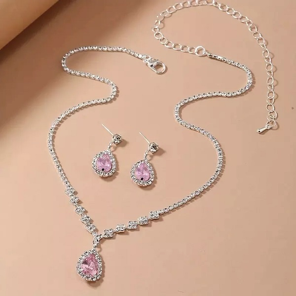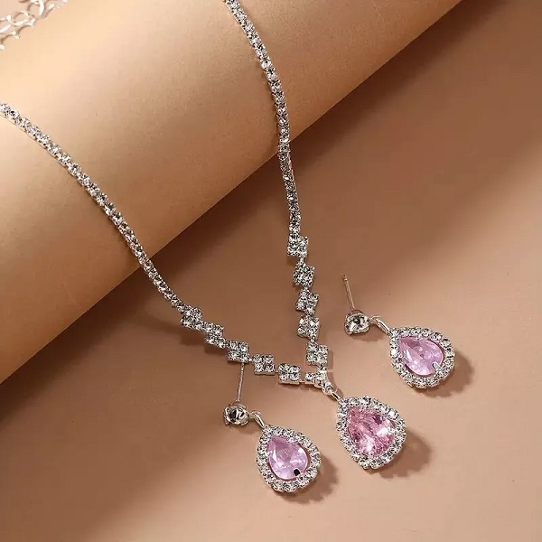 Tea Pink Silver Necklace and Earring Set with Sparkle Rhinestone For Women
