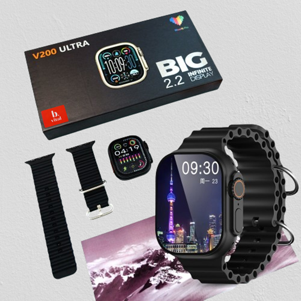 The V200 Ultra Smart Watch Black features a large 2.2-inch screen, is waterproof, and perfect for sports. It’s durable, connects via Bluetooth, and has a long battery life to keep up with your active lifestyle. Simple, yet powerful. V200 Ultra 2.2 smart watch price in Pakistan is Rs. 2990.