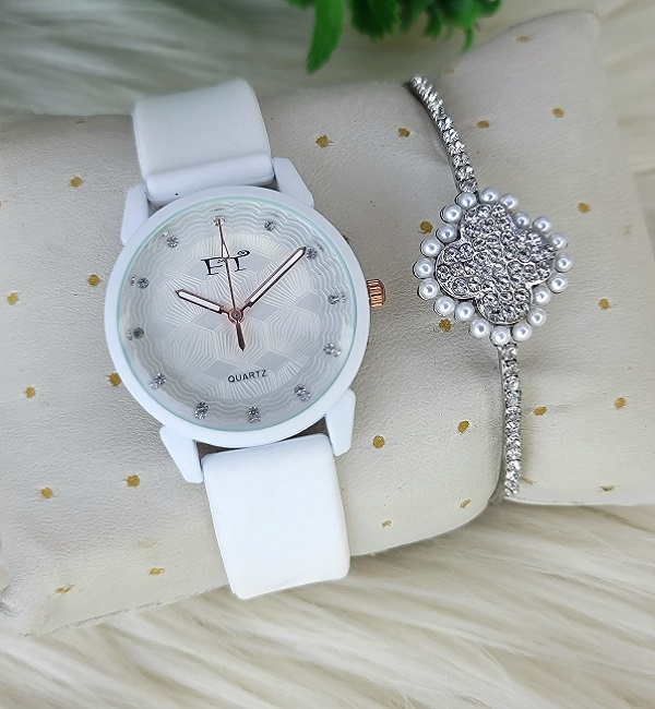 White Fancy Round Shaped Watch with Bracelet For Women