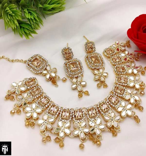 Zircon Mirror Work Necklace Set Earring Matha Patti (ZV:10472)